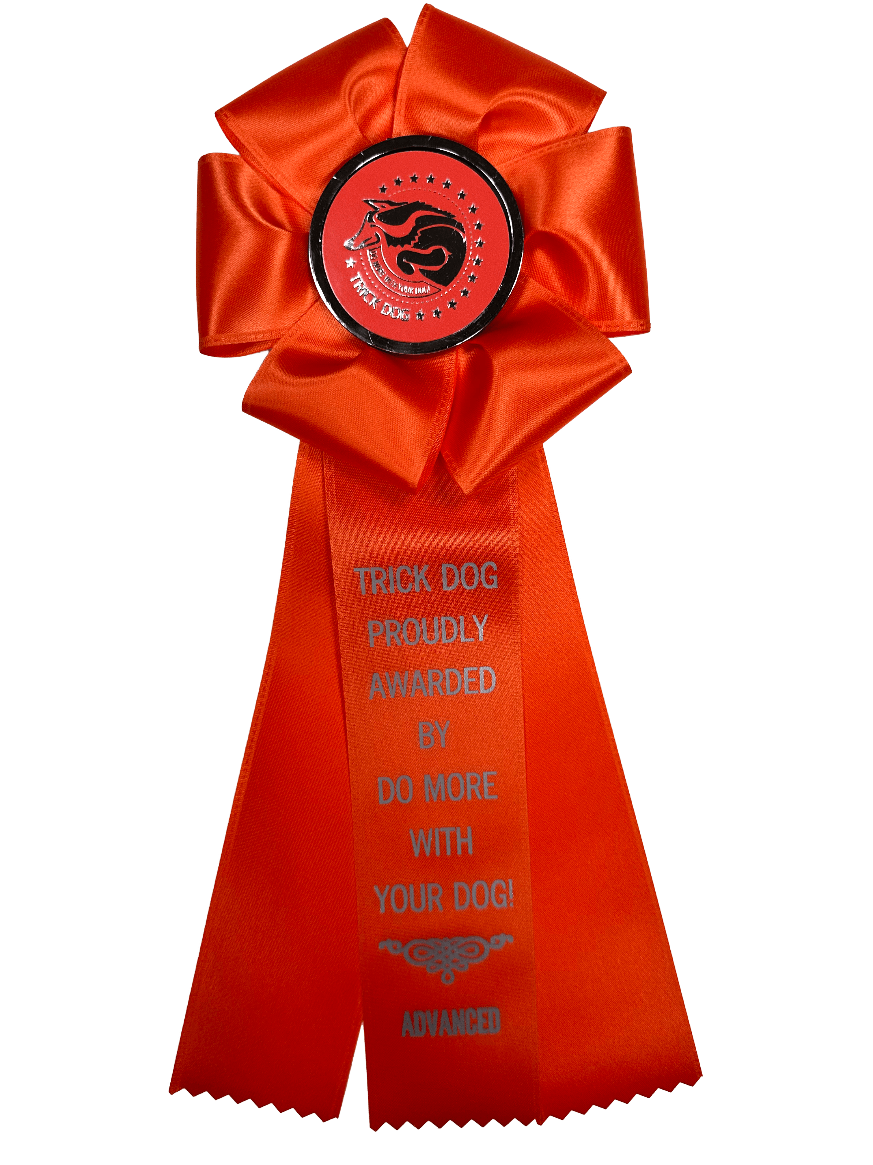 Rosette for your Advanced Trick Dog title. 12″ (30cm) with a metal clip on the back. These can insert into the slot on your certificate. These will ship in a bubble mailer with package-rate shipping costs.