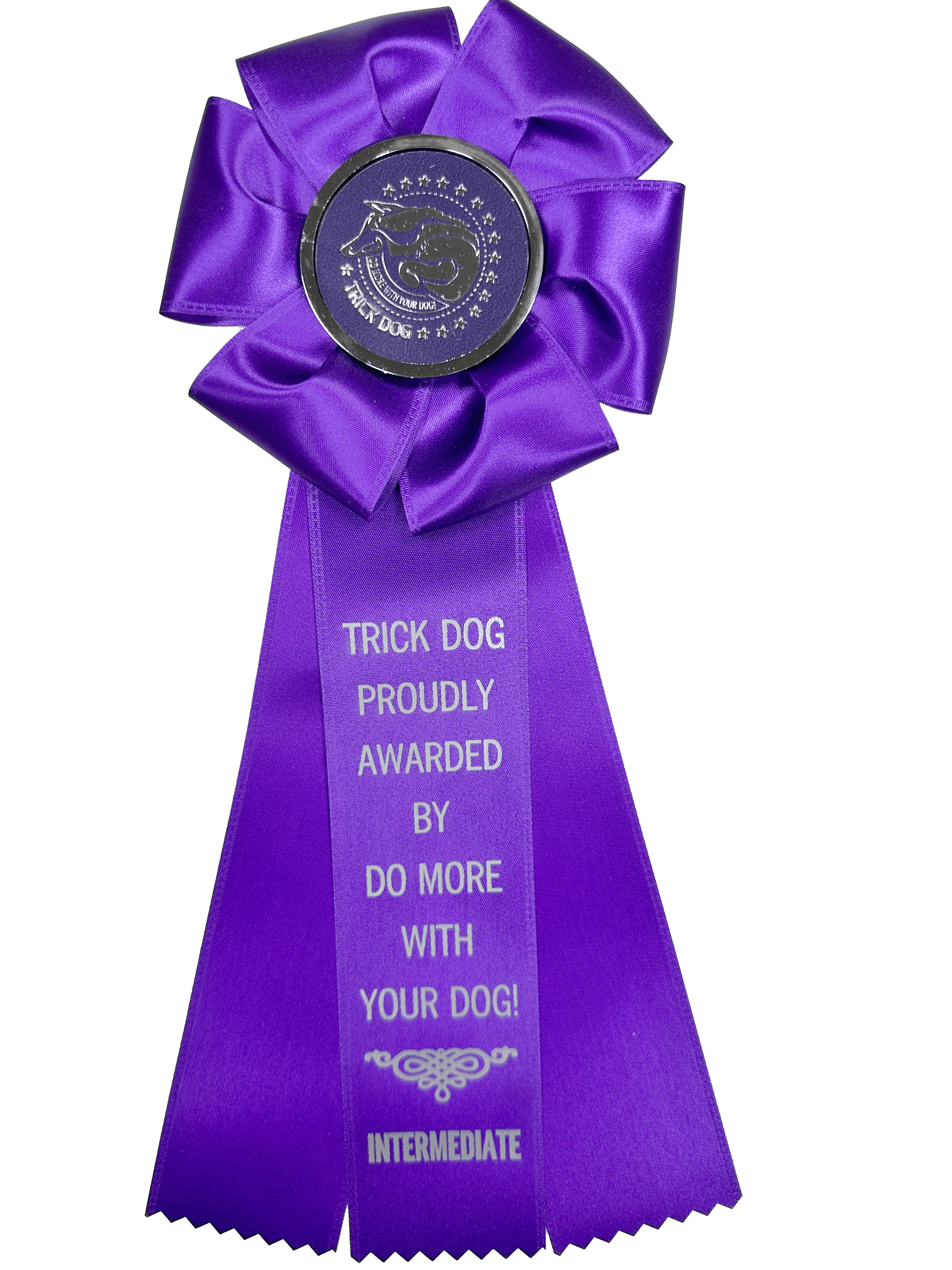 Rosette for your Intermediate Trick Dog title. 12″ (30cm) with a metal clip on the back. These can insert into the slot on your certificate. These will ship in a bubble mailer with package-rate shipping costs.