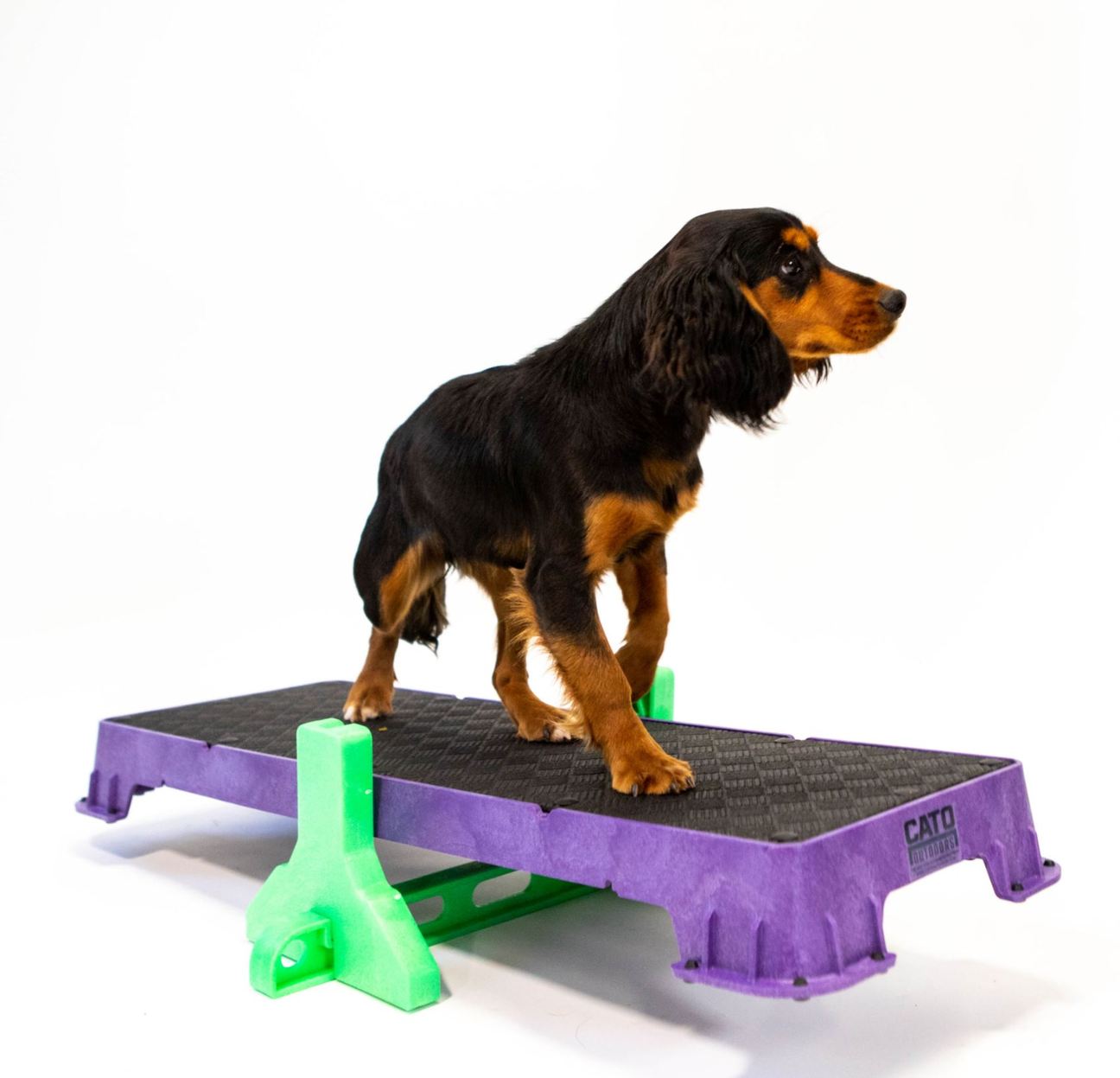 The Cato Tilt Stand can be used to turn the Cato Plank into a multi-height teeter that has settings for 2″, 5″ and 10″. These height gradations mean that even the most timid of dogs can learn to enjoy making the teeter move. The teeter configuration is excellent for transitioning agility training to a full-sized teeter, canine fitness, and puppy proprioceptive development.