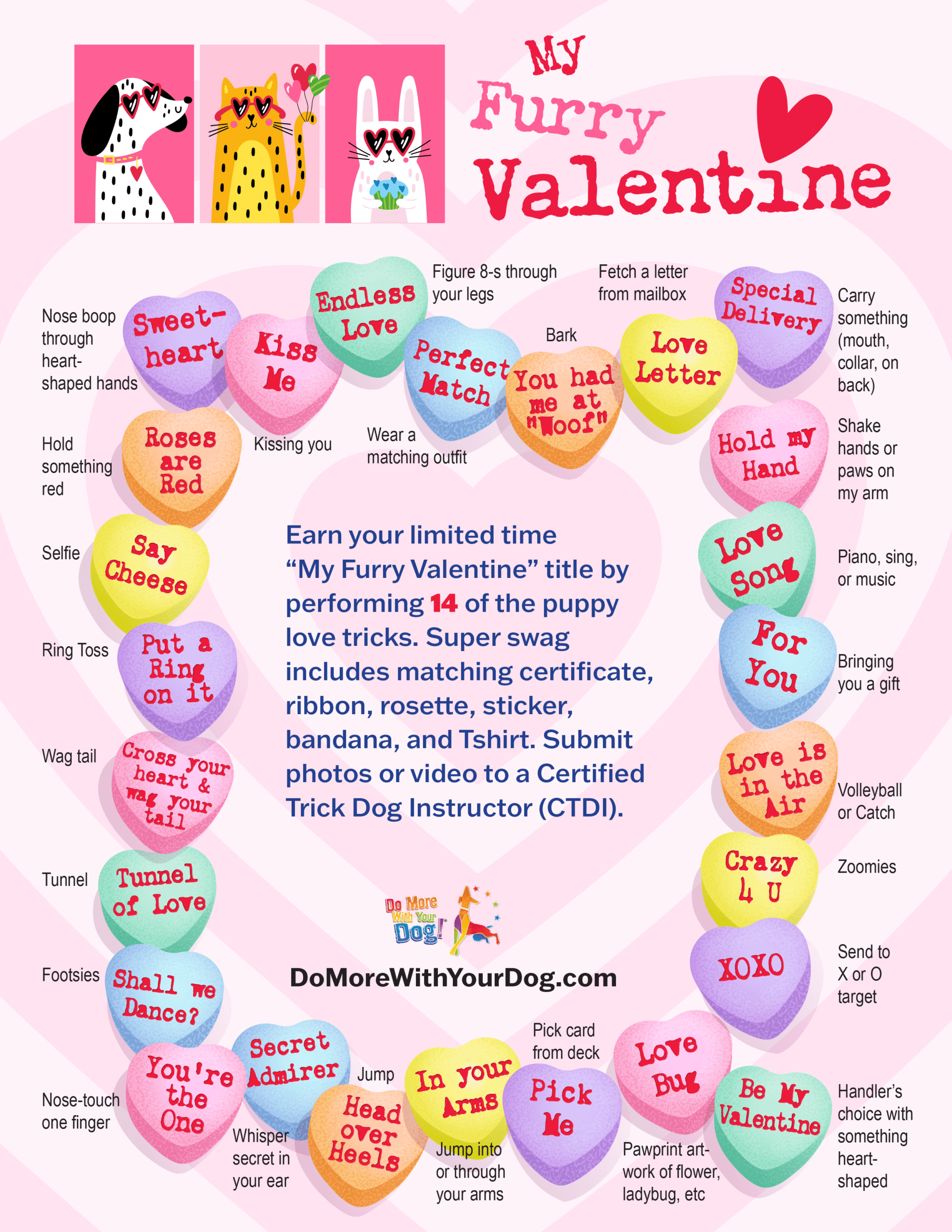 Earn your limited time “My Furry Valentine” title by performing 14 of the puppy love tricks. Super swag includes matching certificate, ribbon, rosette, sticker, bandana, and Tshirt. Submit photos or video to a Certified Trick Dog Instructor (CTDI).