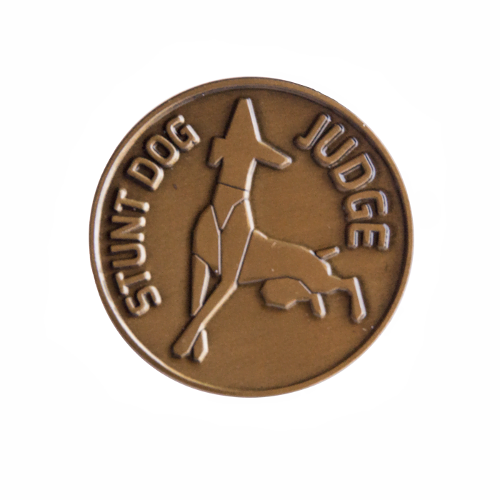 1.25″ die-cast antique-gold colored lapel with butterfly clip. This charm will only be sold to certified Stunt Dog Judges.